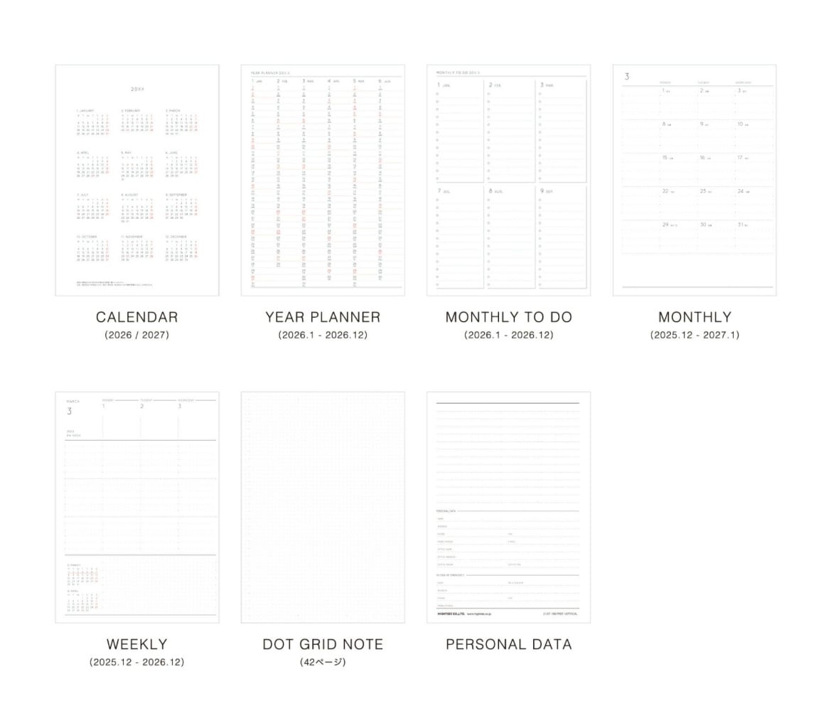 前面の透明ポケットに加え、裏面スリットポケット、3つカードポケット付きで便利なダイアリーです。フラップには薄めの芯材も入ってしっかりとした作り。背の素材を部分的に少しやわらかくすることで手帳も開きやすくなっています。